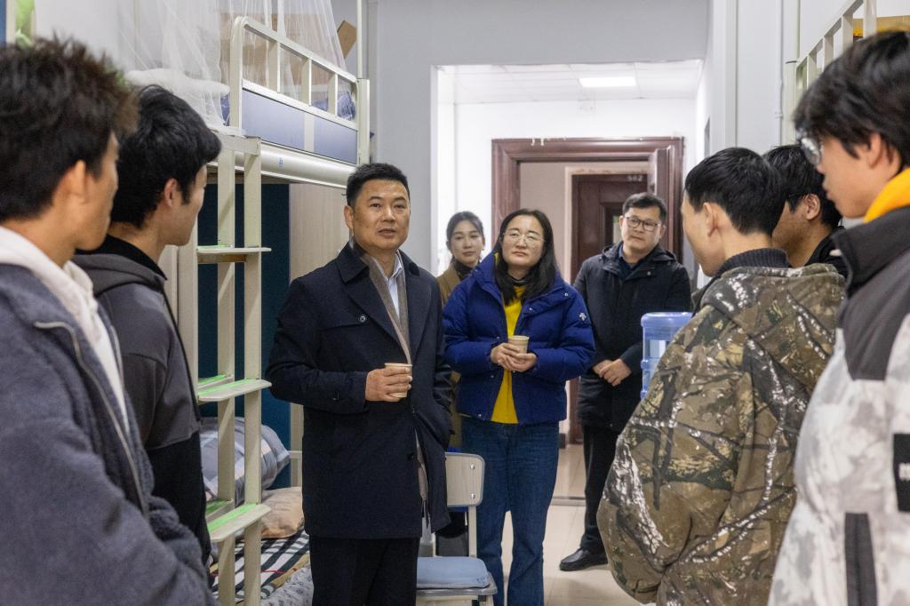在B6-503寢室,沈希仔細查看了同學們的居住環境,了解同學們的學業和生活,分享了自己當年求學經歷。他鼓勵同學們要勤學不怠、懷揣夢想、敢于實現,樹立深造考研目標,高質量就業,在數字海洋中開辟出屬于自己的人生航線;要積極參與學術科研活動,在學科競賽中鍛煉本領、增長才干,不斷提升自身能力,做到“一深廣知、一專多能、素質提升”;要加強體育鍛煉,通過鍛煉提高身體素質,磨練意志,助力實現全面發展和成長。他勉勵同學們,在新的一年好好學習、快樂生活,學校也將持續優化各方面條件,助力同學們成長成才。