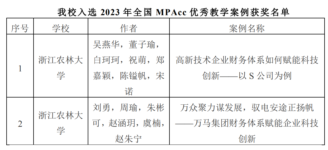 近日,全國會計專業學位研究生教育指導委員會公布了2023年會計碩士專業學位優秀教學案例評選結果。我校經濟管理學院吳燕華團隊和劉勇團隊的2項案例成功入選全國MPAcc優秀教學案例庫。