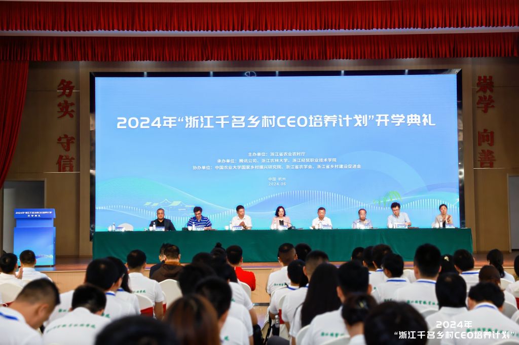 6月28日上午,2024年“浙江千名鄉(xiāng)村CEO培養(yǎng)計劃”開學(xué)典禮在余杭區(qū)余杭街道竹園村文化禮堂舉行。省農(nóng)業(yè)農(nóng)村廳副廳長徐燕峰、科教處處長陳百生,我校副校長吳家勝,浙江經(jīng)貿(mào)職業(yè)技術(shù)學(xué)院校長陳德泉,省鄉(xiāng)村振興促進中心主任王健,騰訊公司可持續(xù)社會價值事業(yè)部副總裁肖黎明,中國農(nóng)業(yè)大學(xué)人文與發(fā)展學(xué)院副院長武晉,余杭區(qū)人民政府副區(qū)長吳偉強,省高質(zhì)量發(fā)展建設(shè)共同富裕示范區(qū)咨詢委員會委員顧益康出席典禮。