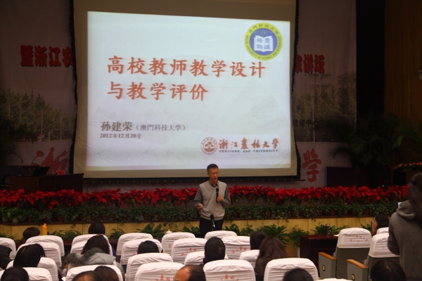 浙農(nóng)林大新聞網(wǎng)訊 12月20日,高校教師教學(xué)設(shè)計(jì)與研究實(shí)踐研修班暨浙江農(nóng)林大學(xué)2012年度第十期教師教學(xué)發(fā)展專家講壇在圖書館第一報(bào)告廳舉行。本次活動(dòng)由我校與教育部全國高校教師網(wǎng)絡(luò)培訓(xùn)中心聯(lián)合舉辦,是我校首次以免費(fèi)形式向全省兄弟院校開放。活動(dòng)邀請(qǐng)到國際著名教育評(píng)估專家澳門科技大學(xué)孫建榮教授、國際課程研究促進(jìn)協(xié)會(huì)主席杭州師范大學(xué)張華教授擔(dān)任報(bào)告主講嘉賓,省內(nèi)兄弟高校50余人、我校首期青年教師研修班、2012年度新教師崗前培訓(xùn)班、教務(wù)處及各學(xué)院(部)近400人參加了活動(dòng)。
