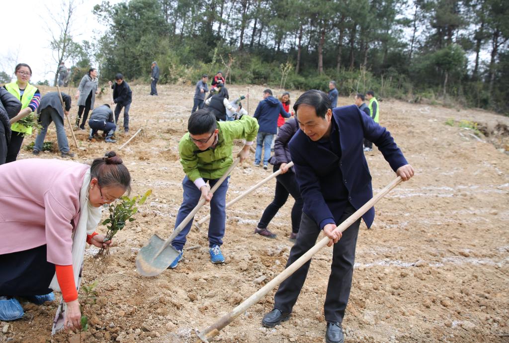 校黨政領導班子成員周國模、方偉、王自勇、鐘平、胡祖吉、童曉暉等與師生代表一起,在東湖校區茗茶園西側區域添種一片新綠。大家揮鍬鏟土,扶苗填坑,踏土夯苗……三五人一組團結協作、滿懷熱情,不到2小時,一萬多株茶樹、50多株福建山櫻花等成排而立。