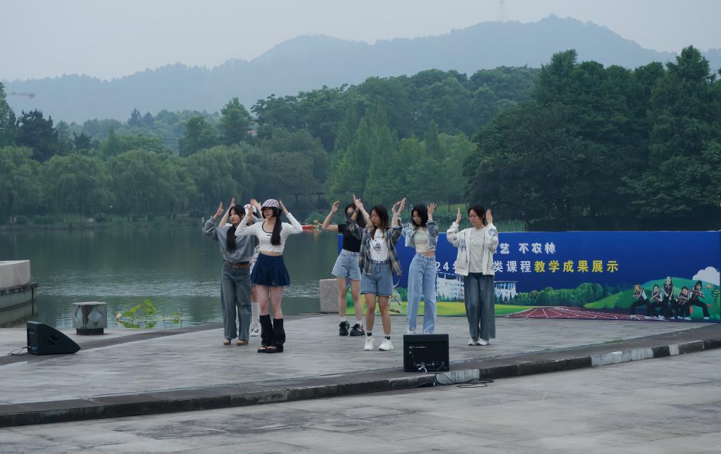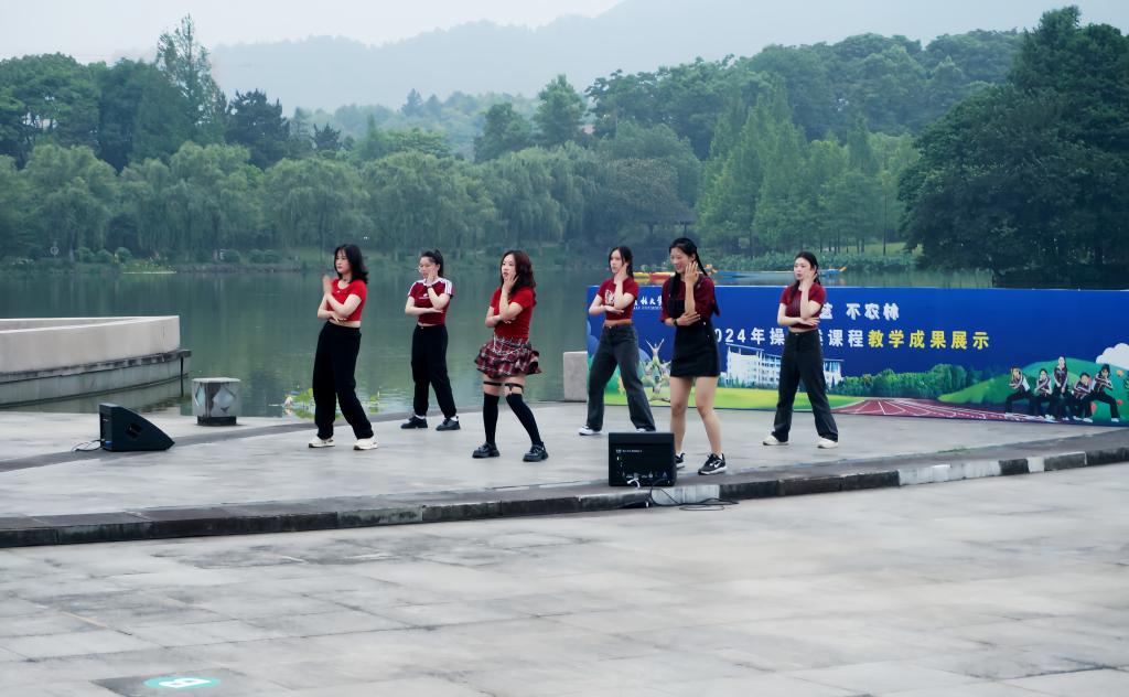 由體軍部魯春娟、趙倩、顧靜霞三位老師指導的,參加操舞類選項課的2022級學生組成近60支參演隊伍,依次進行了匯報表演。在音樂的律動中,他們的動作整齊有力,剛柔并濟,精準到位,體現了力與美、柔韌與剛毅的完美契合,展示了浙農林大學子的青春活力。各隊伍更是在表演過程中將自編的舞蹈動作與傳統的操舞動作完美融合,精彩的表演一次次將活動推向了高潮。