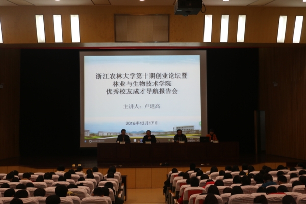 12月17日晚,浙江農林大學2016年第十期創業論壇暨林業與生物技術學院優秀校友成才導航報告會在圖書館第一報告廳舉行,1996屆林學專業校友、浙江綠亞景觀建設有限公司董事長盧廷高應邀作主題報告。創業處處長朱永法,林生院相關負責人、創業中心老師和500余名學生參加了論壇。