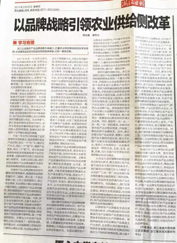 2月23日,《浙江日報》刊登農民發展研究中心主任顧益康、副主任潘偉光理論文章《以品牌戰略引領農業供給側改革》。