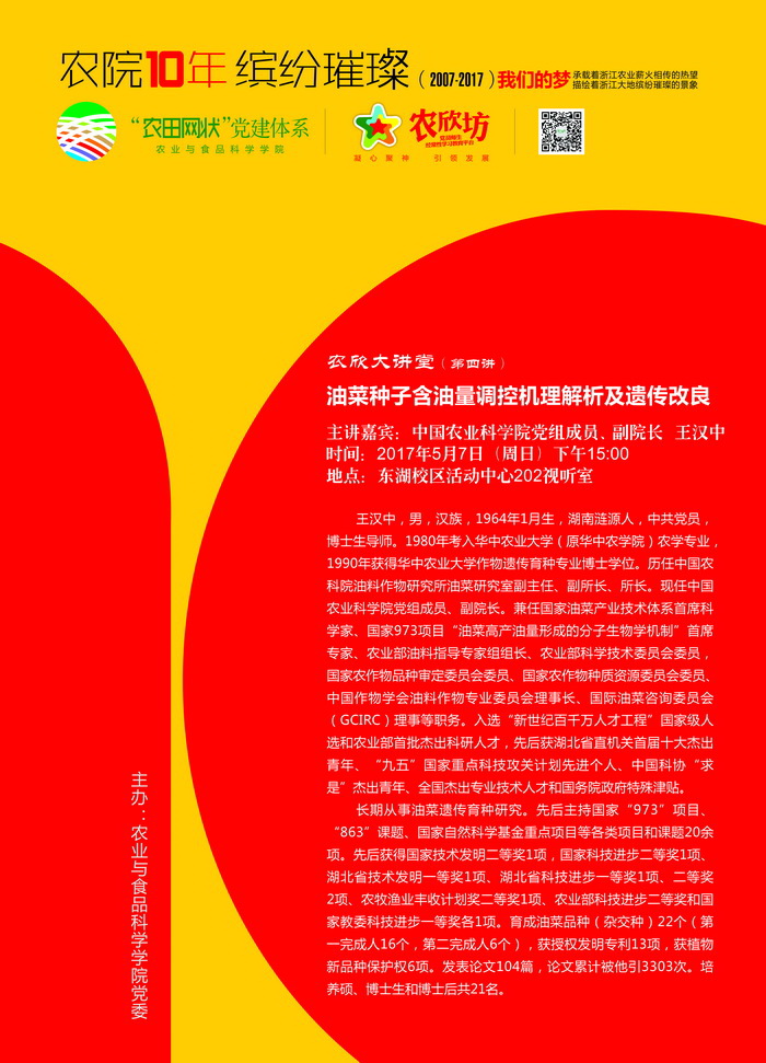 農欣大講堂(第四講):中國農科院副院長王漢中《油菜種子含油量調控機理解析及遺傳改良》